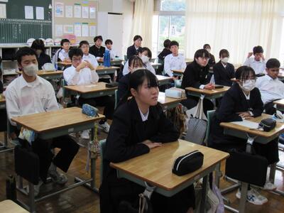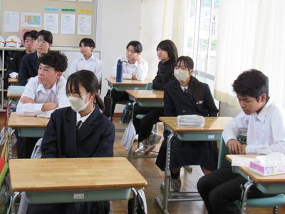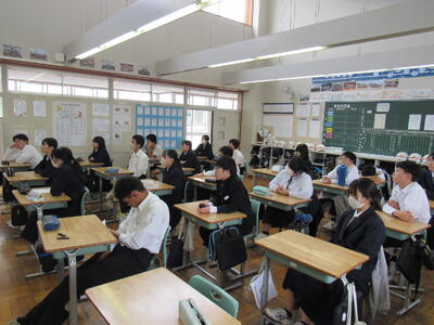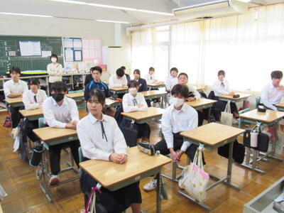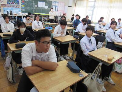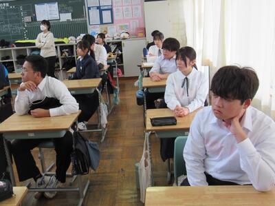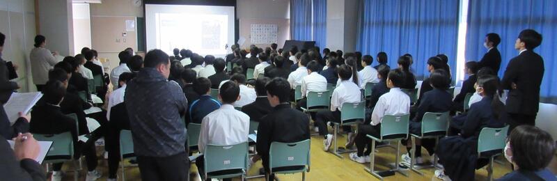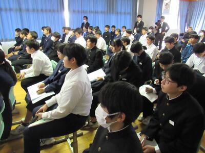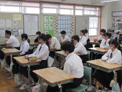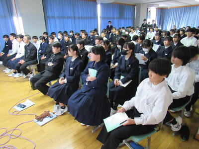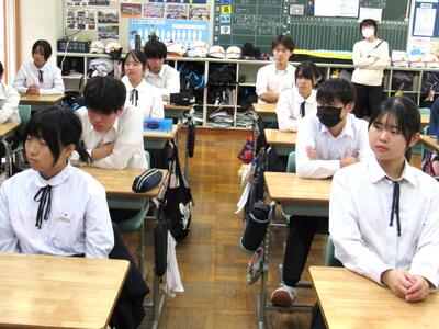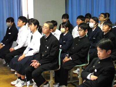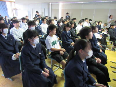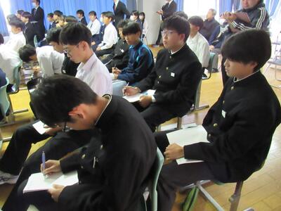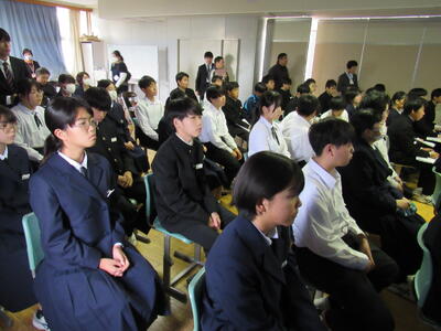 〇私の今やりたいことはまだ明確に決まっていなかったけど、先生の話を聞いて「まだ、私はいろいろな仕事を知らないのか」と実感しました。自分の好きな分野を大学などでもっと理解を深めて、その分野・関連の職業に就くことも楽しそうで、私は自分自身の得意分野を将来に生かしたいと思いました。今後は、受験を控えているので、今やるべきことをしっかりして、自分自身の好きなことを生かせるような道を開きたいと思いました。(本城さん 3年)