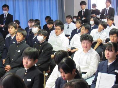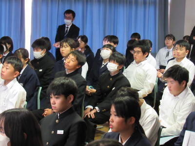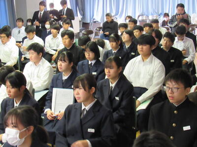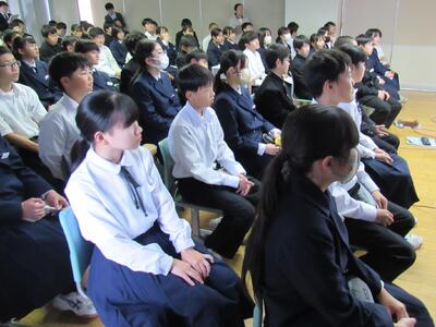 〇感謝を忘れないことや、いろいろなことを大切に思うことができる等、基礎となることを大切にすることを学びました。自分の好きなことを最後までやり通すことが、とてもかっこいいと思いました。今後は、片田江さんが言っていたように、キャリアの構築は選択の積み重ねなので、単なるAとBを選ぶのではなく、先を見据えて選んでいきたいです。(鈴木陽さん2年)
