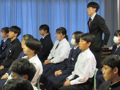 〇講演を聴いて一番印象に残ったことは、私たちへのメッセージのお言葉です。「先人が歩いた道がなければ、自分で切り開く」という言葉の意味がとても深く感じました。「目の前のことをがむしゃらに頑張る」では、勉強や部活動が一番に思い浮かびました。そして「感謝を忘れない」ように、これからも生活していきたいです。今後は、目の前のこと(勉強や部活動)を一生懸命に取り組み、これから自分なりに工夫してチャレンジしていきたいと思います。(柳町さん 2年)