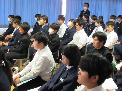 【目的】起業家の方の考え方や行動力、チャレンジ精神を中学生に伝えると共に、今の中学生に求めることを伝えていただき、今後の学習・生活の糧とする。