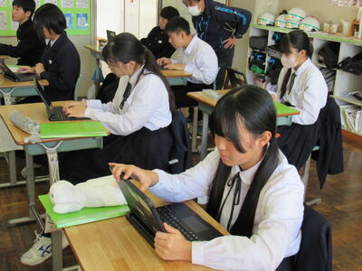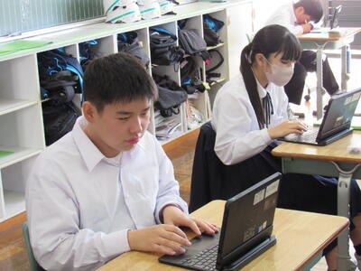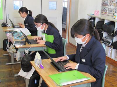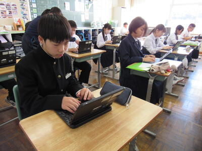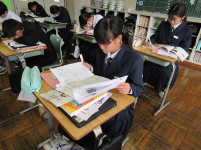 地域と関連付けた探究学習(例:香取市の産業、観光、災害対策、環境問題、少子化対策等)を各自で進めています。