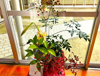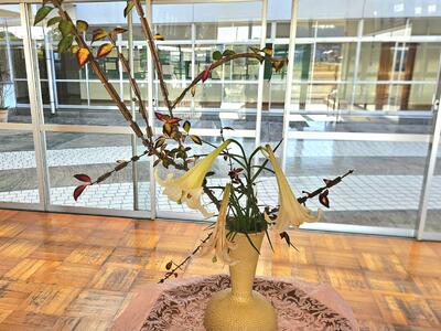 玄関等に大戸地区の坂下さんが定期的に季節の花を生けてくれています。本当に有り難いことです。生徒の皆さん、足を止めて季節の花々に心を和ませてみてはどうでしょうか。 〇前回の生け花←クリック