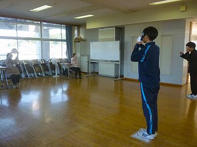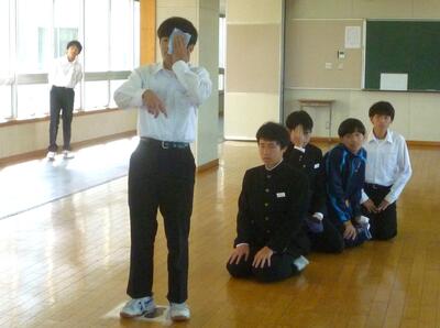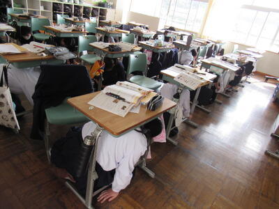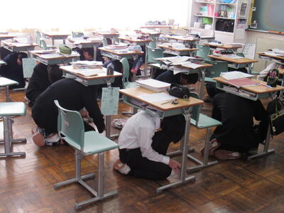 今回は、地震想定のワンポイント訓練です。生徒、教員は事前に訓練のことは知らず、一次避難まで行いました。