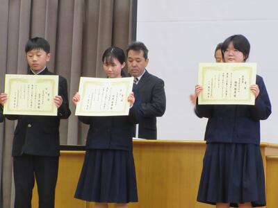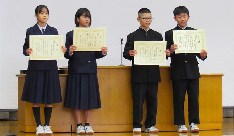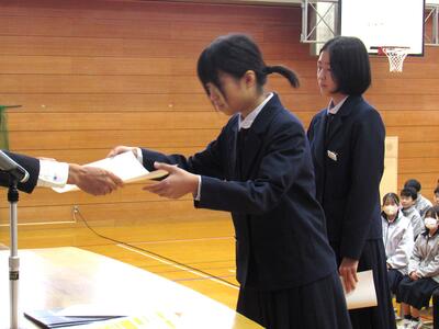 全校集会前に表彰伝達を行いました。社会を明るくする運動作文コンテストで表彰された金子さん(1年)の作品を紹介します。