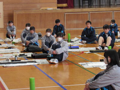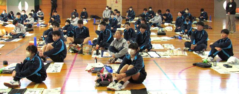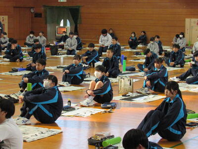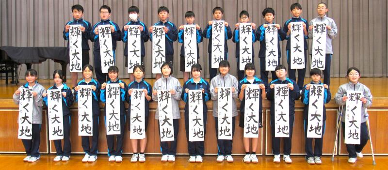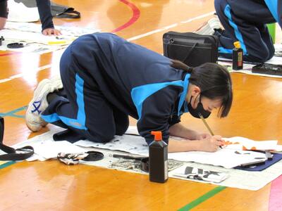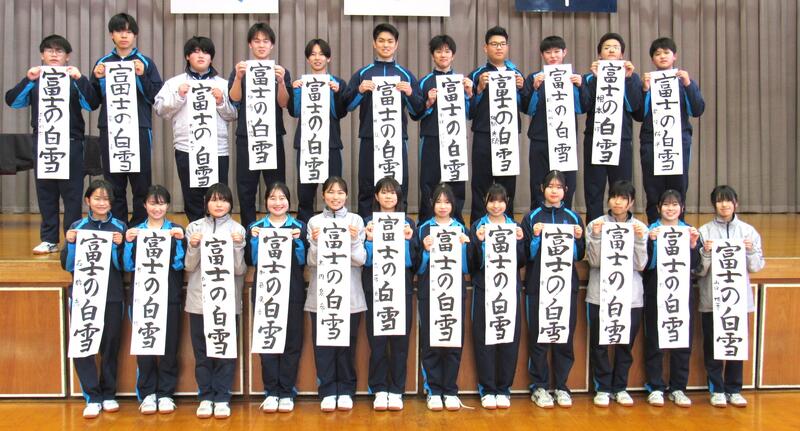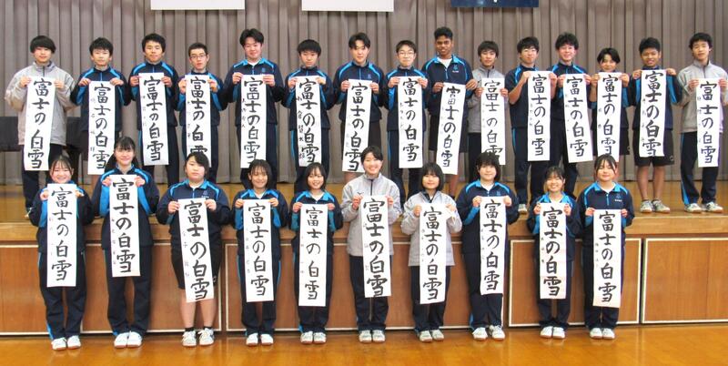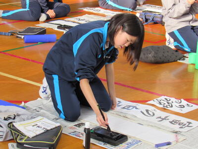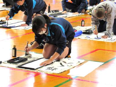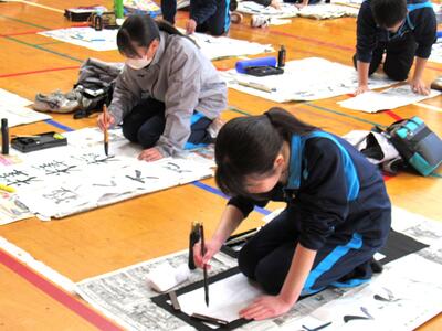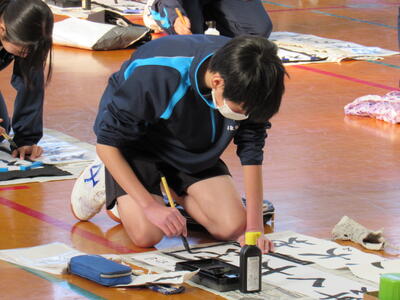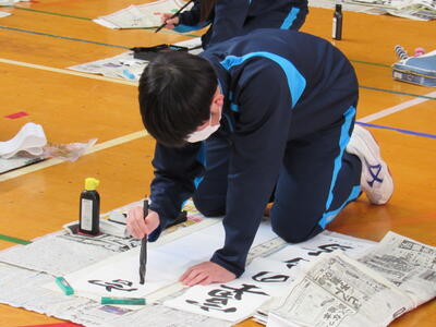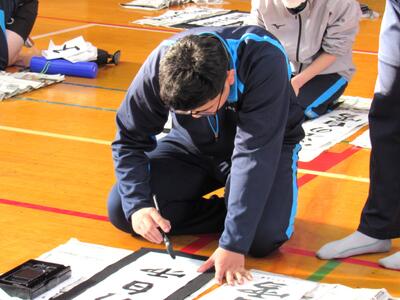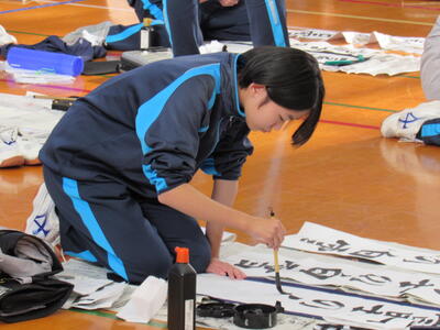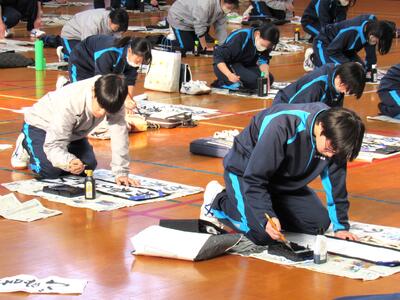 1月8日(木)校内書き初め大会を体育館で行いました。生徒たちは、1文字1文字丁寧に「書に心を込めて」取り組むことができました。1年生は「輝く大地」、2年生は「初春の喜び」、3年生は「富士の白雪」を仕上げました。生徒の皆さん、日本文化の一つ「書き初め」の経験は大切にしたいですね。