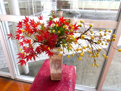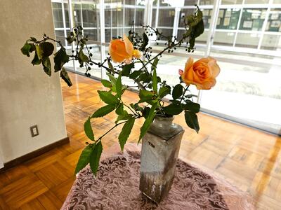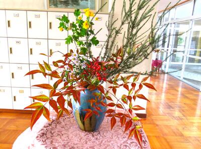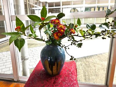 玄関等に大戸地区の坂下さんや橋本さん(四季の丘)が定期的に季節の花を生けてくれています。本当に有り難いことです。生徒の皆さん、足を止めて季節の花々に心を和ませてみてはどうでしょうか。