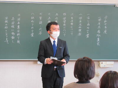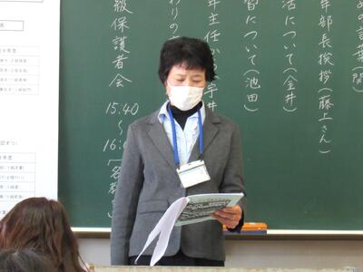 PTA会長から、本部役員の活動内容等について説明をしていただきました。来年度の本部役員候補が皆様の立候補で決まることを願っています。1学年本部役員2名は、学年PTAで立候補があり決定しました、御協力ありがとうございます。2年生は、Formsで再募集していますので、よろしくお願いします。