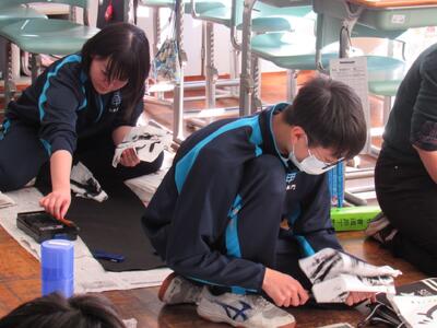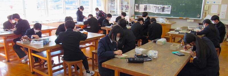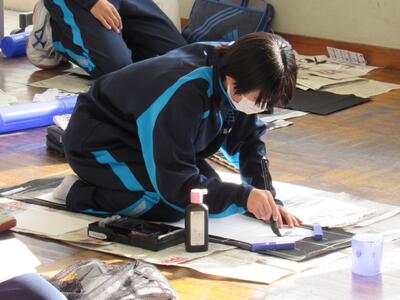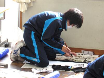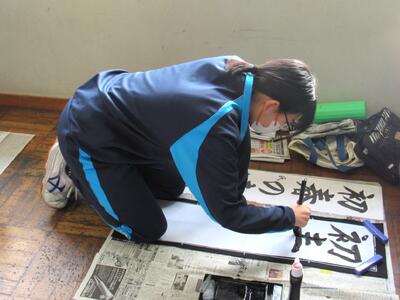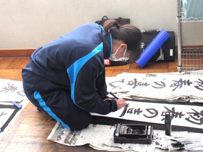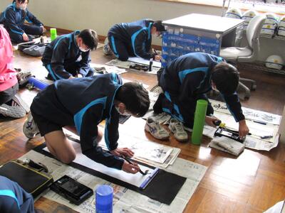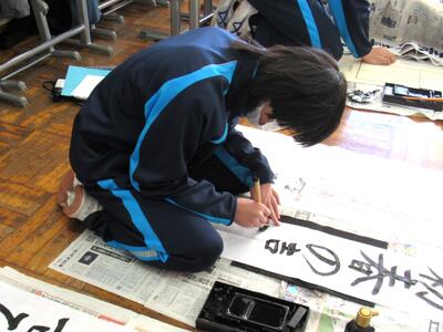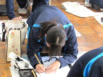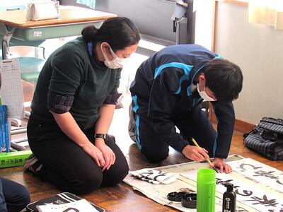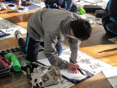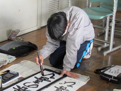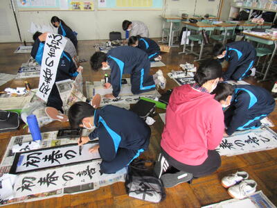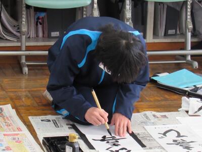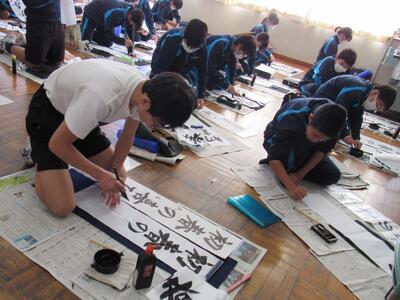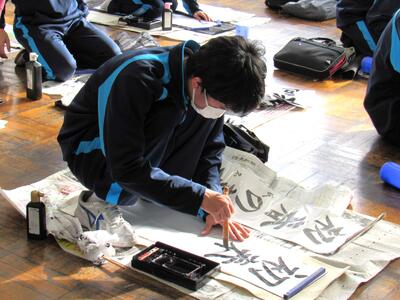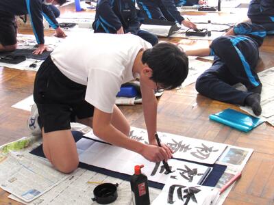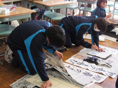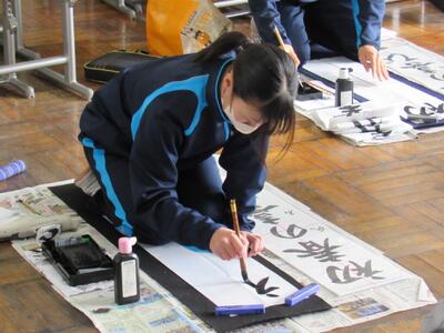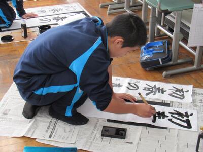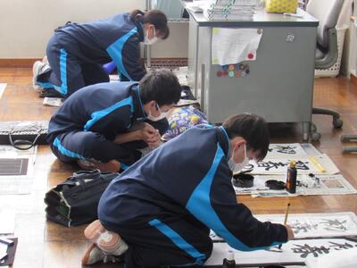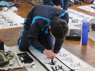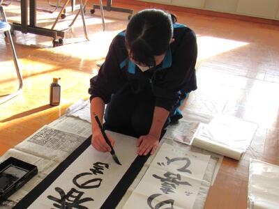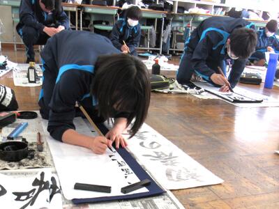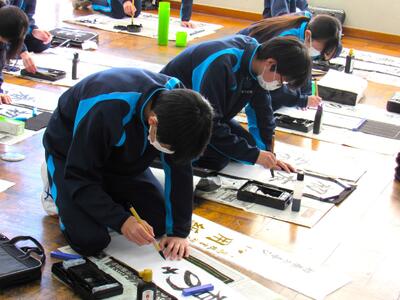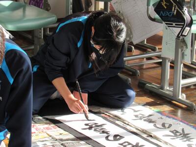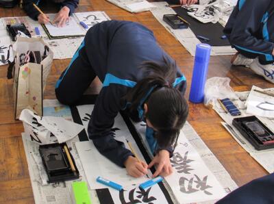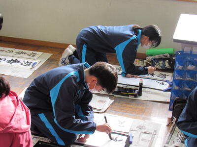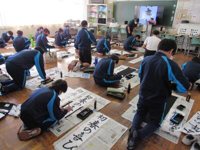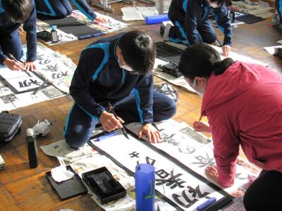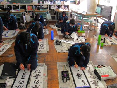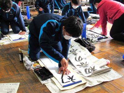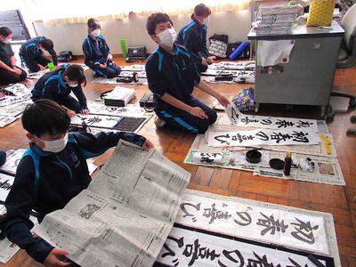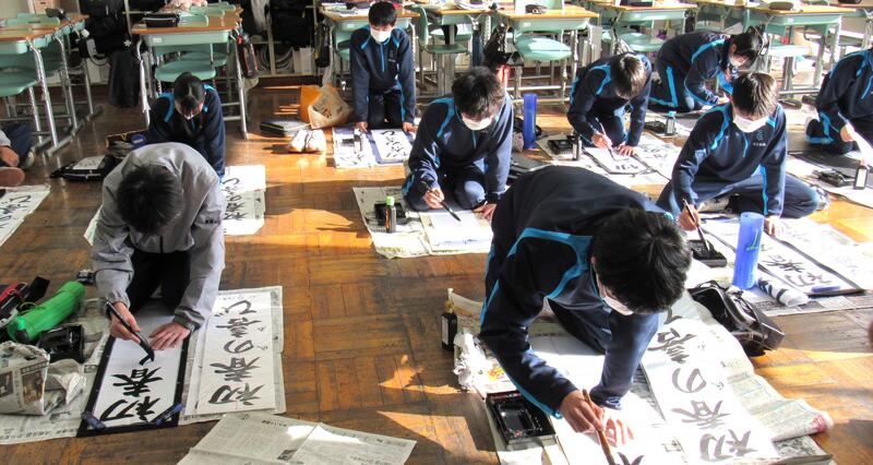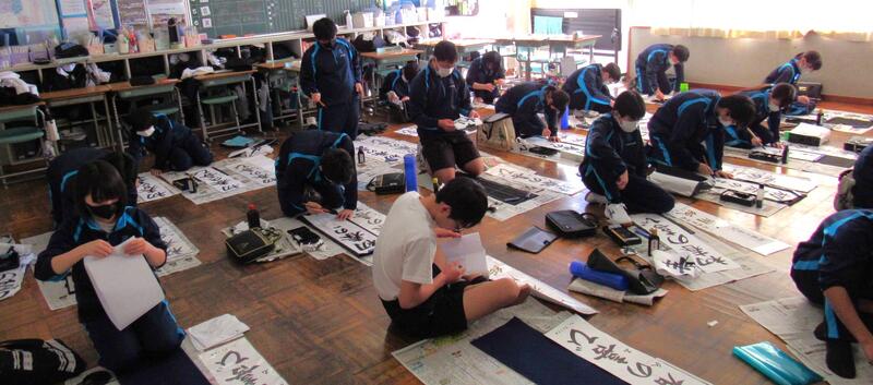 国語で習字の学習です。生徒の皆さん、題字『初春の喜び』を1文字1文字丁寧に練習しています。