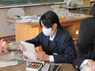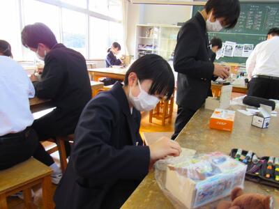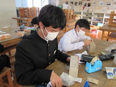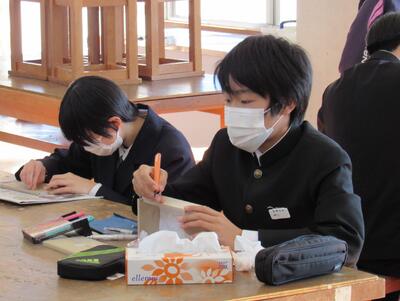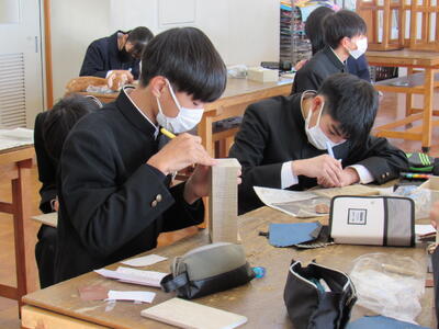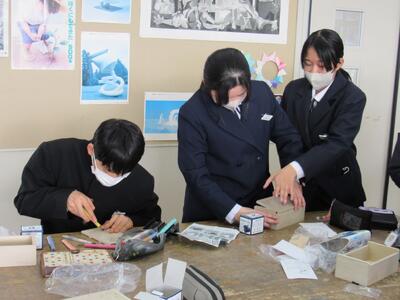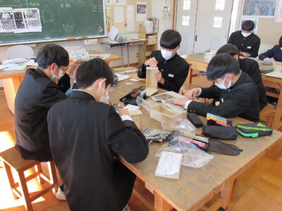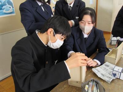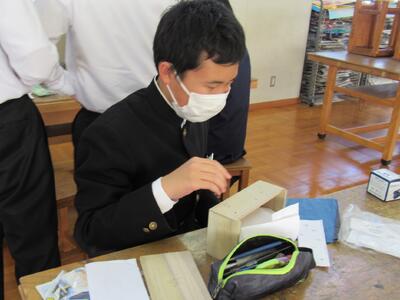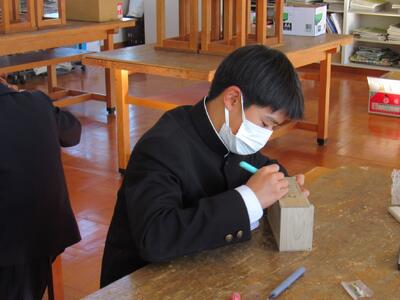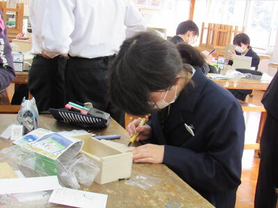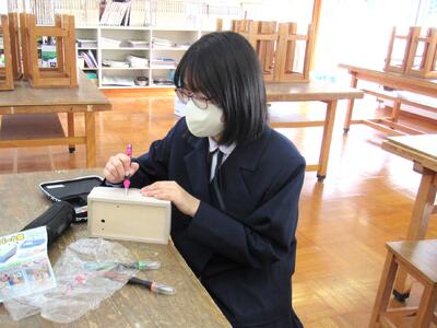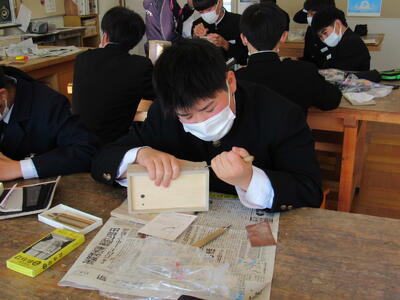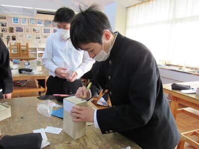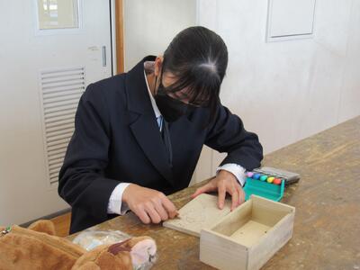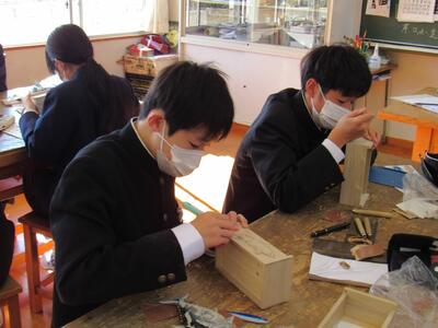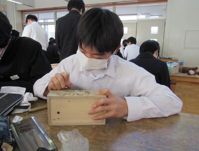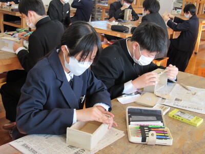 美術で彫刻の学習に取り組んでいます。皆さん、一人一人集中してオルゴールを仕上げています。
