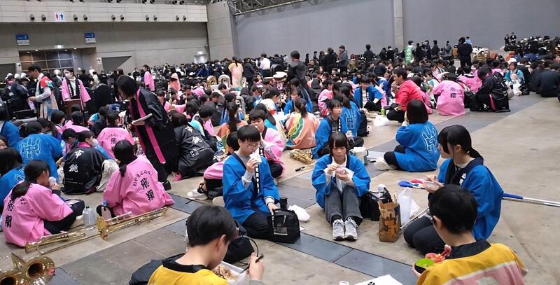 出演に向けてメッセ内で準備している参加者が、ものすごい人数です。3000人が、同時に昼食を食べています。