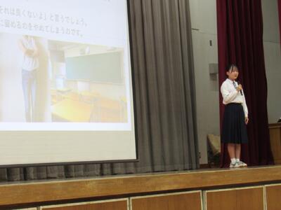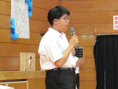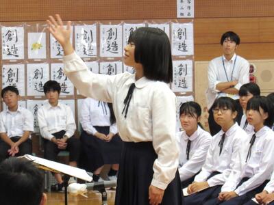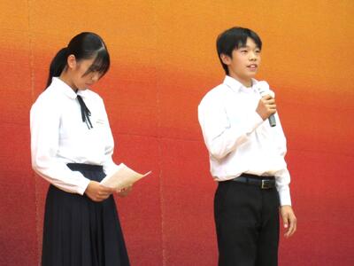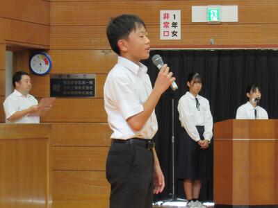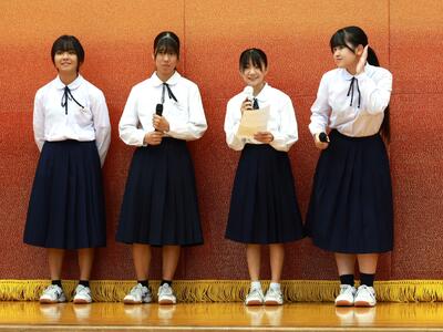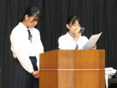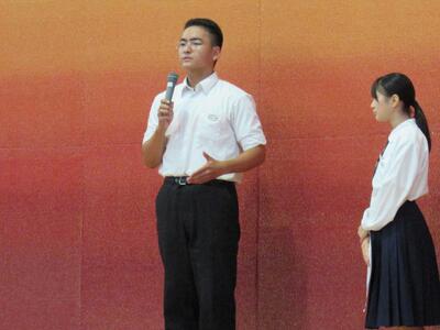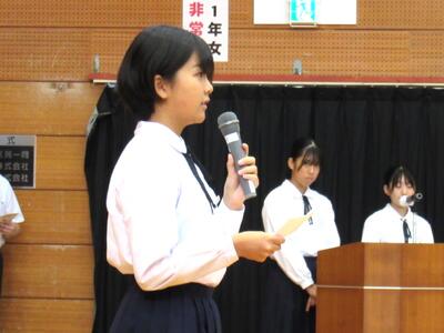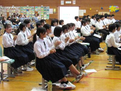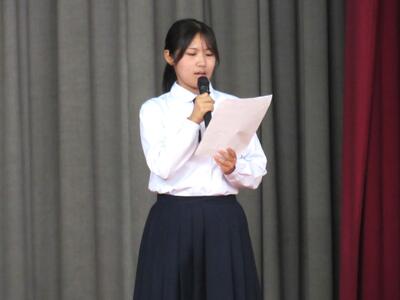 10月10日(金)前期終業式が行われました。各学年の代表生徒から、前期の振り返りと後期に向けての抱負が発表されました。皆さん、自分の思いをしっかりと伝えることができました。