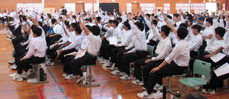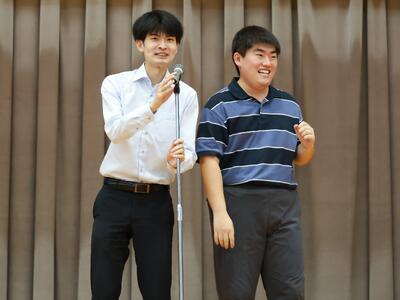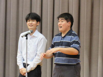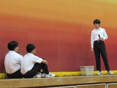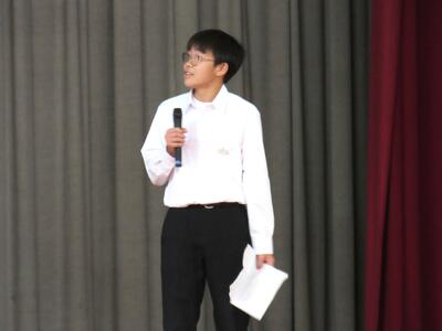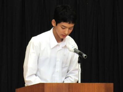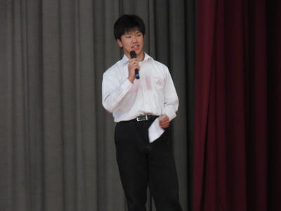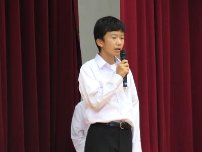 僕はこの学校をよりよくするために、二つのことを実行することを約束します。一つ目は、みんながもっと協力し合える学校を目指すことです。そのことによって学年関係なく、みんなが仲良くなる、そんな学校をつくれると思います。二つ目は、生徒が意見を言うことができる機会を増やすことです。そのような機会を増やすことによって、みんなが学校に求めていることが可視化でき、的確な行動が可能になると思いました。私が生徒会長になったら、このようなことをしていきたいと思っています。是非、応援よろしくお願いします。