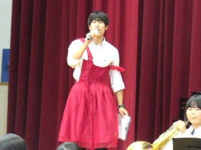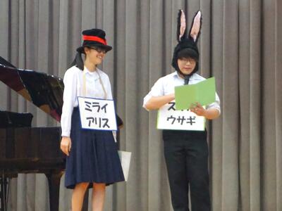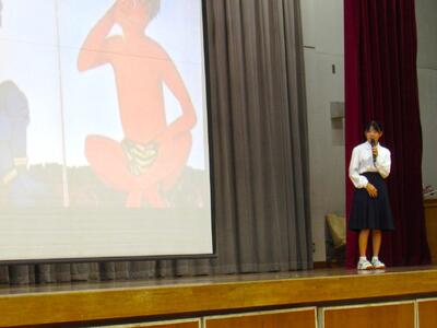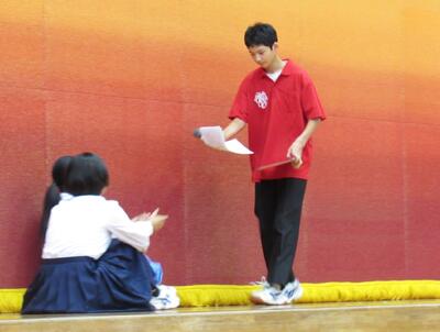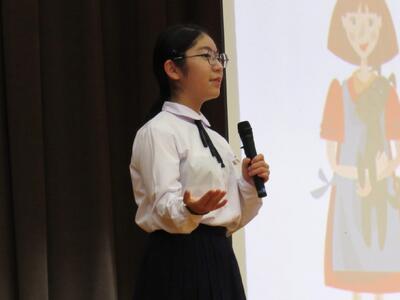 三つ目は、英語のスピーチコンテストです。私は「オズの魔法使い」の一場面を英語で発表しました。気持ちを込めて表現するのはとても難しく、発音や声の大きさ、身振り、手振りなど、思うようにできないこともありましたが、一緒に参加した友達や先輩方と練習したり、先生にアドバイスをもらったりしながら、少しずつ自信を付けていきました。本番ではとても緊張しましたが、発表を終えたときには大きな達成感とやりとげた喜びを感じました。