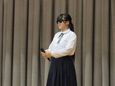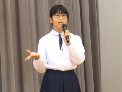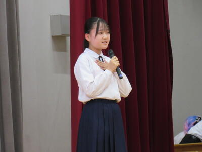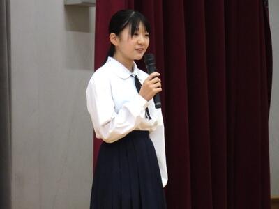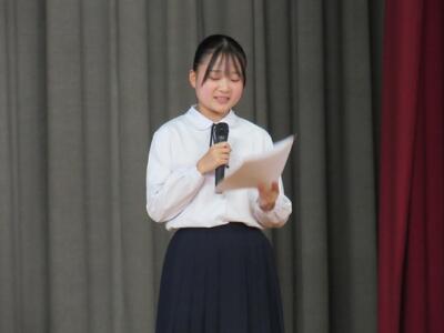 私が立候補した理由は、生徒会本部の皆さんが学校の中心となり、行事を運営している姿を見て、とても憧れたからです。私も本部の一員として活動し、みんながより楽しく過ごしやすい学校生活にしていけるように頑張ります。私は、『挨拶が自然と響き合う学校』『行事に全力で取り組める学校』にしていきたいと考えています。まず、「おはよう」「こんにちは」が元気よく飛び交う学校。先生も友達も、互いに顔を見て挨拶するだけで1日が明るく元気に始まるはずです。そして、行事。準備や振り返りを必ず行い、仲間と力を合わせて全力で取り組むことで、一生モノの思い出になると思います。一人一人の「こんにちは」「がんばろう」が、この学校を変える力になります。清き1票、よろしくお願いします。