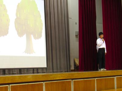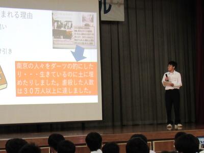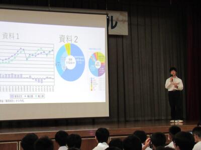 総合的な学習の時間では、『国際』『環境』『健康』『福祉』『人権』について、探究活動を進めてきました。3年生は、自分たちで調べたことをプレゼンテーションでまとめ、先日、発表会を行いました。その中から代表4名が、様々な課題について多くの資料を用いて発表しました。生徒の皆さん、日頃から社会への視野を広くもって、探究心を大切にしてください。