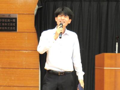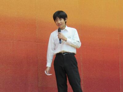 僕が立候補した理由は、誰かを支え、役に立つことで明るい学校を目指すためです。僕は、誰にでも平等な意見を持ち、たくさんの人の声を聞いてよりよく意見の形を変えていきたいと思います。そのために、二つの行いたいことがあります。一つ目は、意見ボックスの活用です。誰でも気軽に意見を言えるような学校にしたいです。二つ目は、率先した挨拶です。「自分から挨拶」を心掛け、明るい雰囲気に包み込まれて毎日が楽しい学校生活を実現するつもりです。そのために、皆さんの声や応援が必要です。僕と一緒に明るい雰囲気を築きあげましょう。応援、よろしくお願いします。