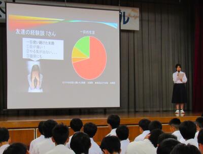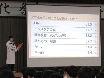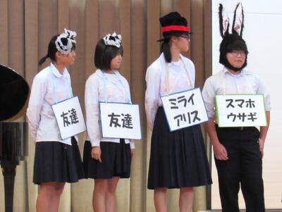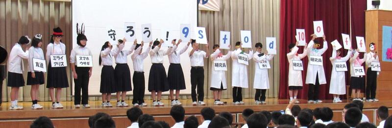 保健委員会も皆さんが、スマホの上手な使い方について、アンケート結果をもとに演劇(スマホの国のアリス)で分かりやすく発表しました。生徒の皆さん、スマホの使い過ぎ(身体や生活への悪影響)にならないために、是非9ストップ10オフを意識していってほしいと思います。