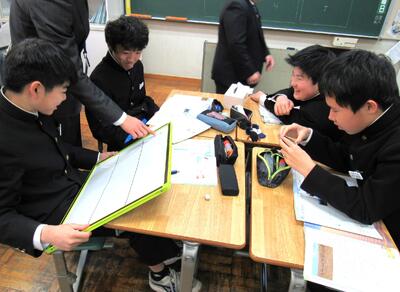 理科で「力の大きさ」の学習に取り組んでいる様子です。実験でバネの伸びを観察しています。