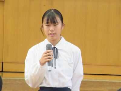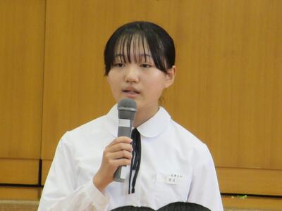 私が立候補した理由は、生徒会本部の皆さんが学校の中心となり、行事を運営している姿を見て、とても憧れたからです。私も本部の一員として活動し、みんながより楽しく過ごしやすい学校生活にしていけるように頑張ります。私は、『挨拶が自然と響き合う学校』『行事に全力で取り組める学校』にしていきたいと考えています。まず、「おはよう」「こんにちは」が元気よく飛び交う学校。先生も友達も、互いに顔を見て挨拶するだけで1日が明るく元気に始まるはずです。そして、行事。準備や振り返りを必ず行い、仲間と力を合わせて全力で取り組むことで、一生モノの思い出になると思います。一人一人の「こんにちは」「がんばろう」が、この学校を変える力になります。清き1票、よろしくお願いします。