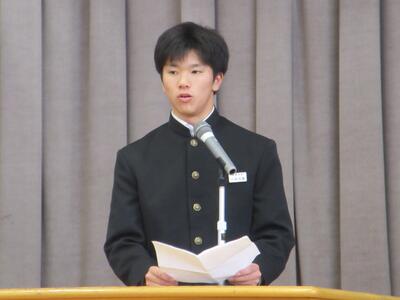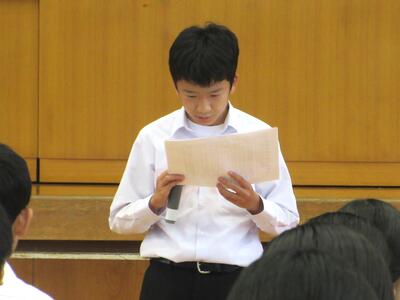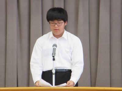 僕が立候補した理由は、誰かを支え、役に立つことで明るい学校を目指すためです。僕は、誰にでも平等な意見を持ち、たくさんの人の声を聞いてよりよく意見の形を変えていきたいと思います。そのために、二つの行いたいことがあります。一つ目は、意見ボックスの活用です。誰でも気軽に意見を言えるような学校にしたいです。二つ目は、率先した挨拶です。「自分から挨拶」を心掛け、明るい雰囲気に包み込まれて毎日が楽しい学校生活を実現するつもりです。そのために、皆さんの声や応援が必要です。僕と一緒に明るい雰囲気を築きあげましょう。応援、よろしくお願いします。