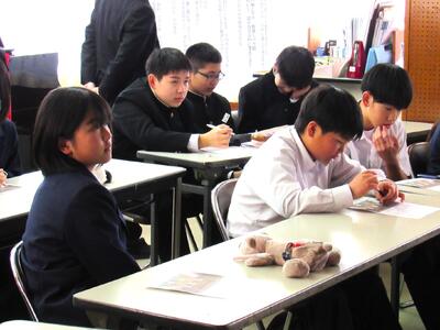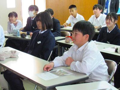 〇先生の話を聞いて、大学院まで行って好きなことを学び続けていてすごいと思いました。先生の「道がなければ自分で切り開く」という言葉が心に残ったので、すぐに諦めるのではなく、自分なりに頑張ろうと思いました。私は今、将来何になろうか、はっきり決まっていません。なので私は、先生が教えてくださった、目の前のことをがむしゃらに頑張ろうと思います。(大竹さん 1年)