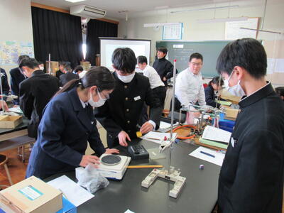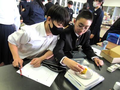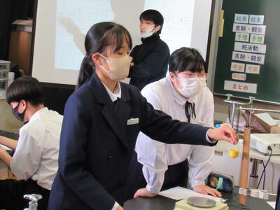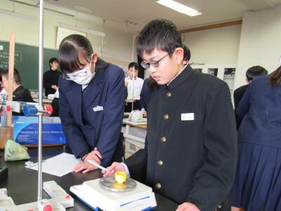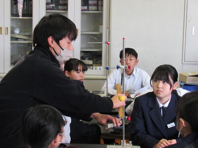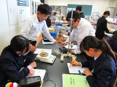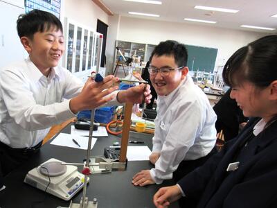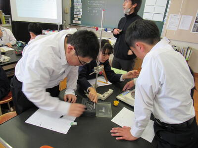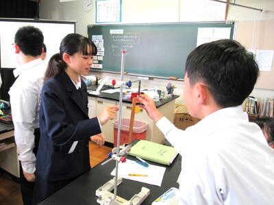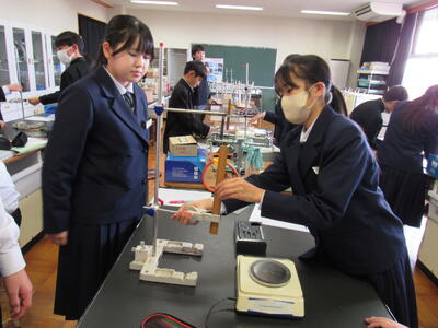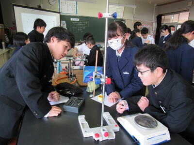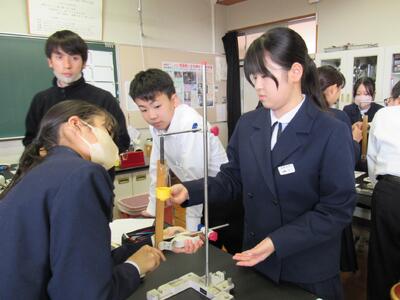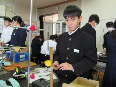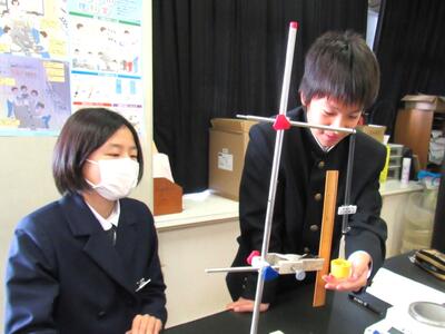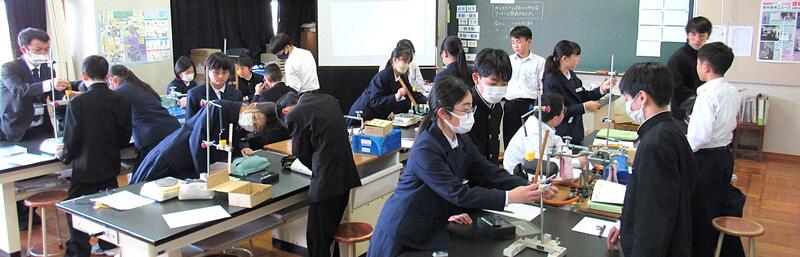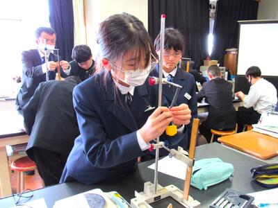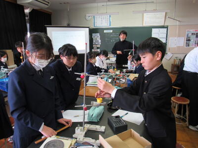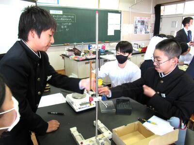 理科で「力の大きさ」の学習に取り組んでいる様子です。実験でバネの伸びを観察しています。