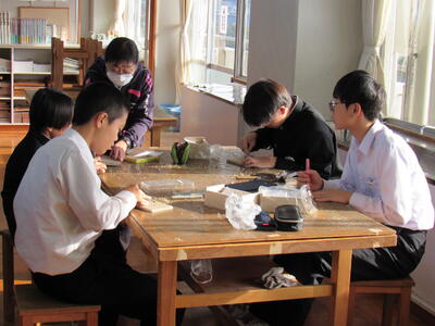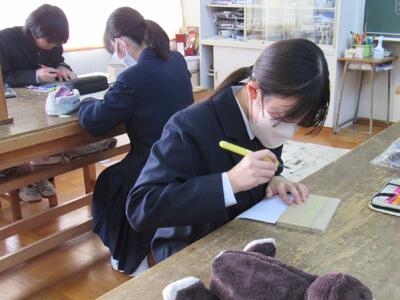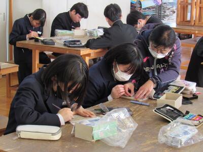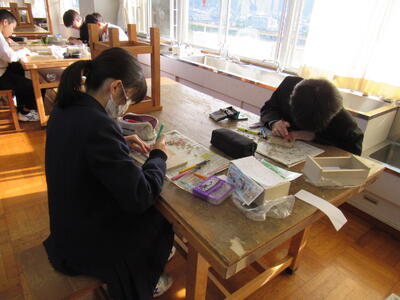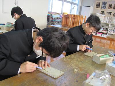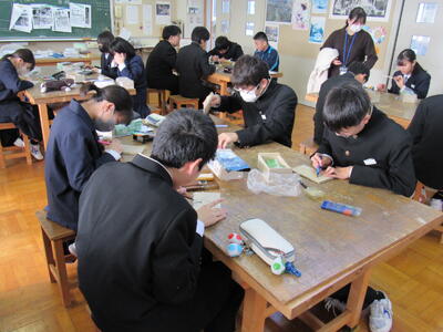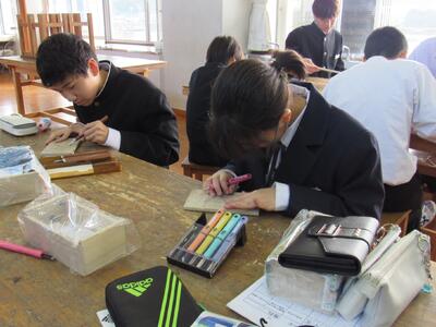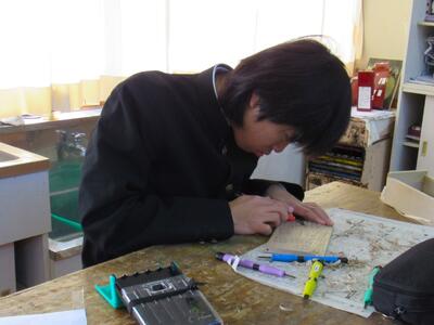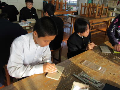 版画の学習に取り組んでいます。皆さん、一人一人集中して作品を仕上げています。