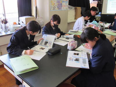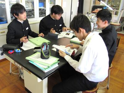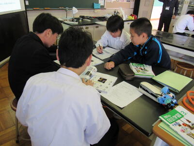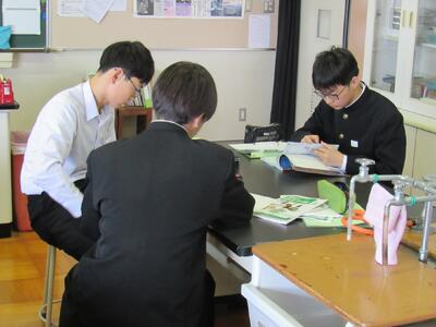 3年生の授業の様子です。総合的な学習の時間で、修学旅行(京都・奈良方面)の計画を立てています。今回は、班別学習2日目を班ごとに相談しています。