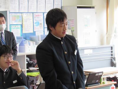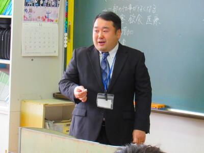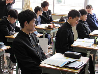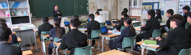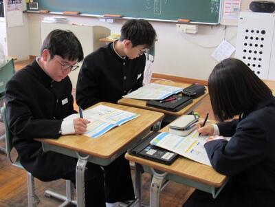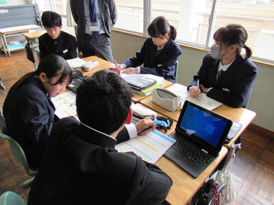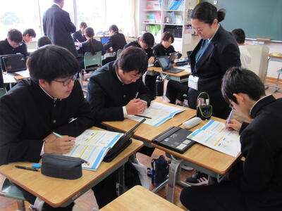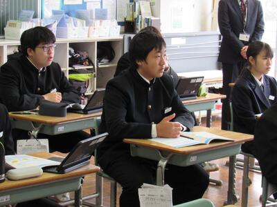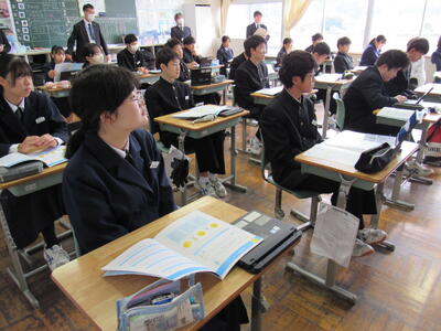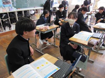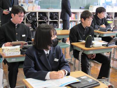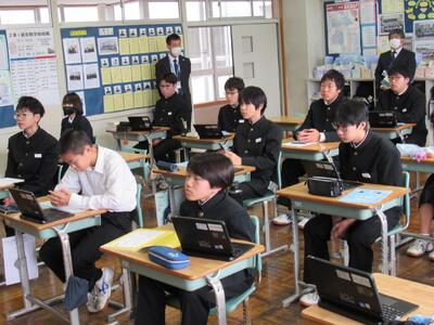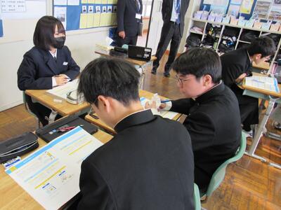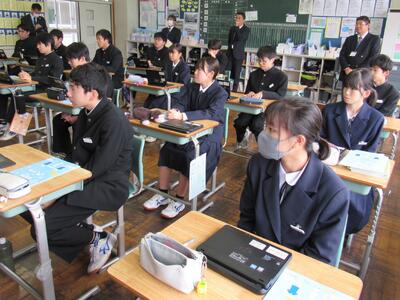 2年生が総合的な学習の時間にキャリア教育の授業を行い、県教育委員会等から5名の先生が参観されました。将来の職業について、多面的・多角的に捉えるよい機会となりました。