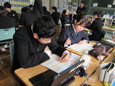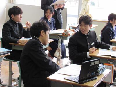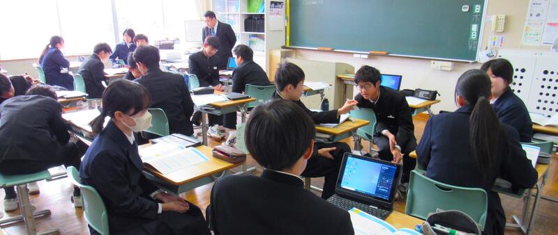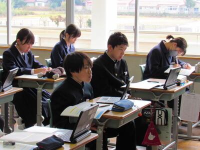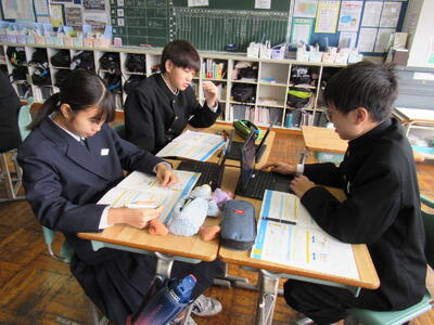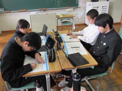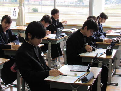 地域と関連付けた探究学習(例:香取市の産業、観光、災害対策、環境問題、少子化対策等)を各自で進めています。