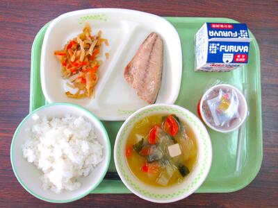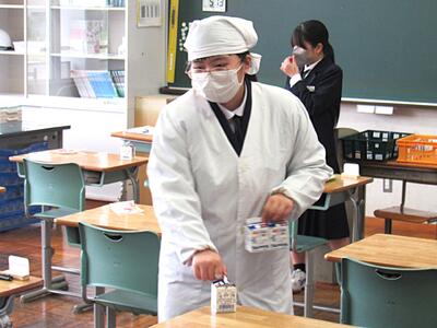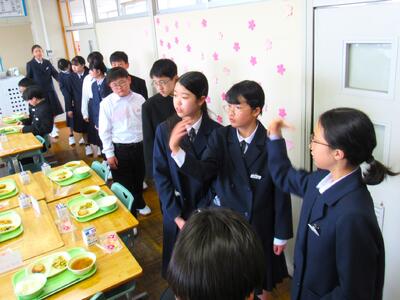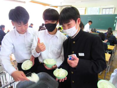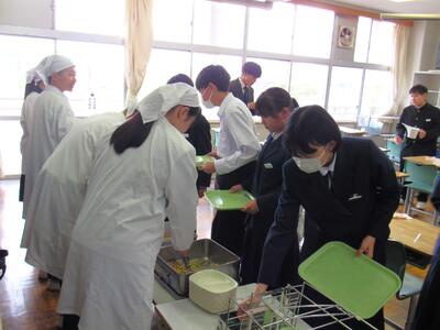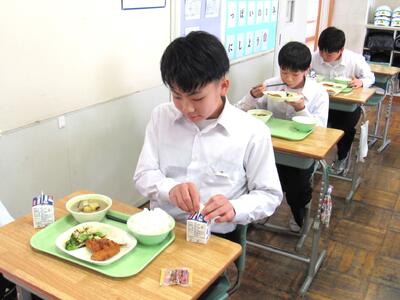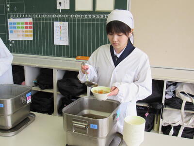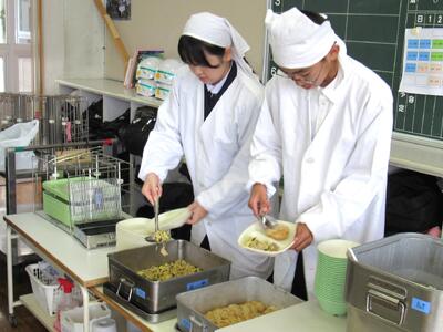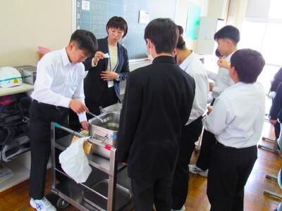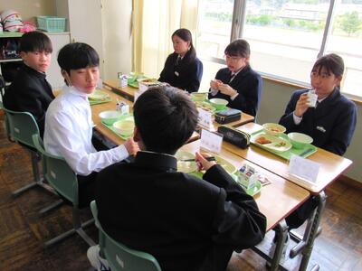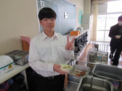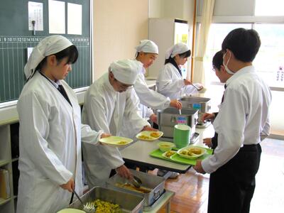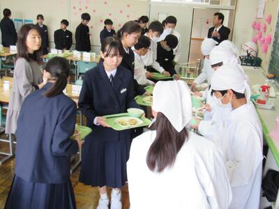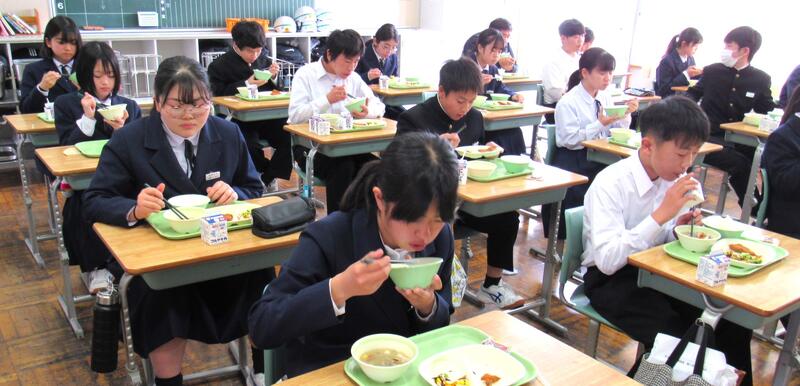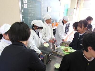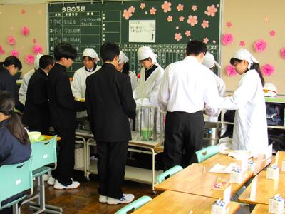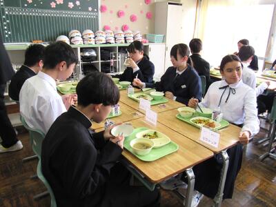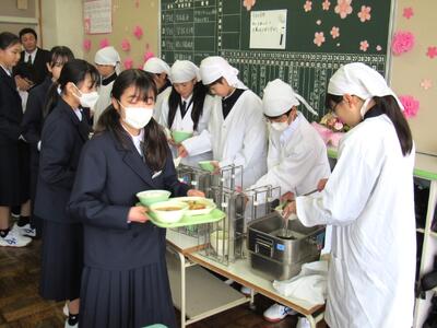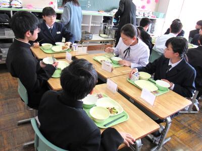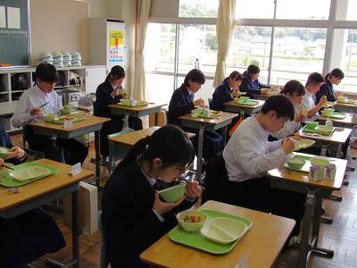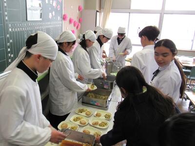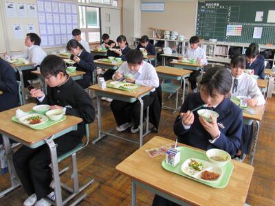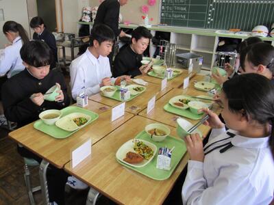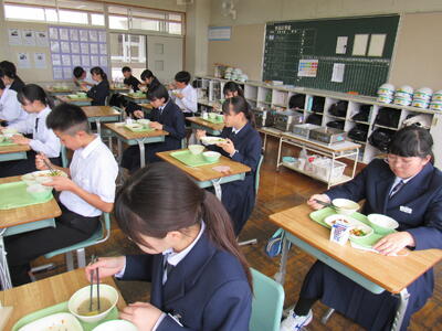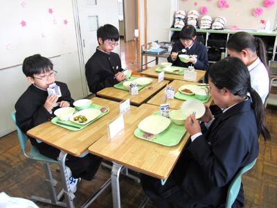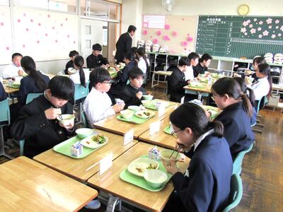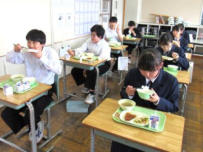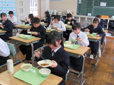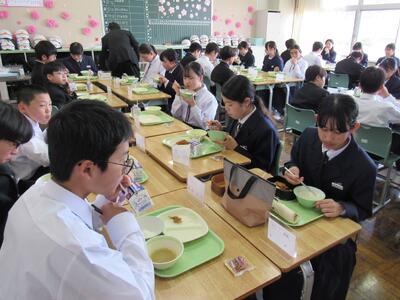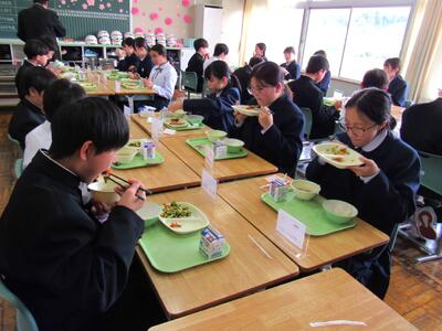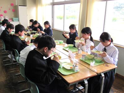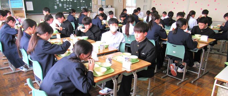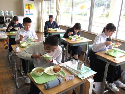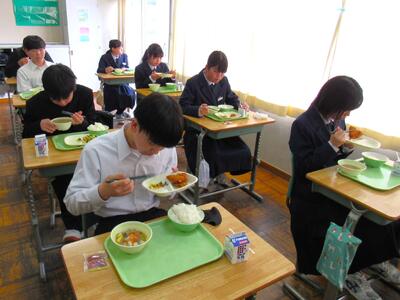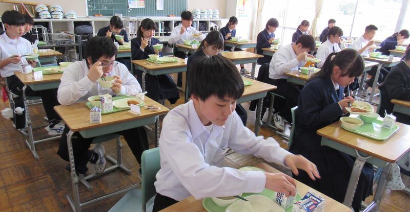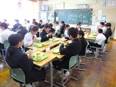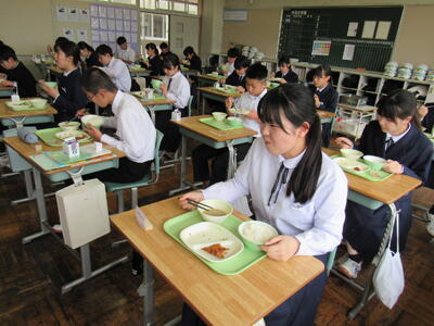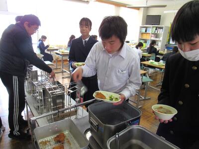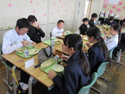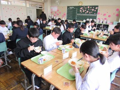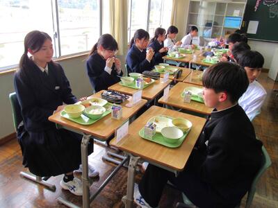 1・2年生の給食の様子です。生徒にとって楽しみな給食の時間、どの学級も協力して配膳していました。生徒の皆さん、栄養バランスの良い給食ですので、なるべく残さず食べましょう。