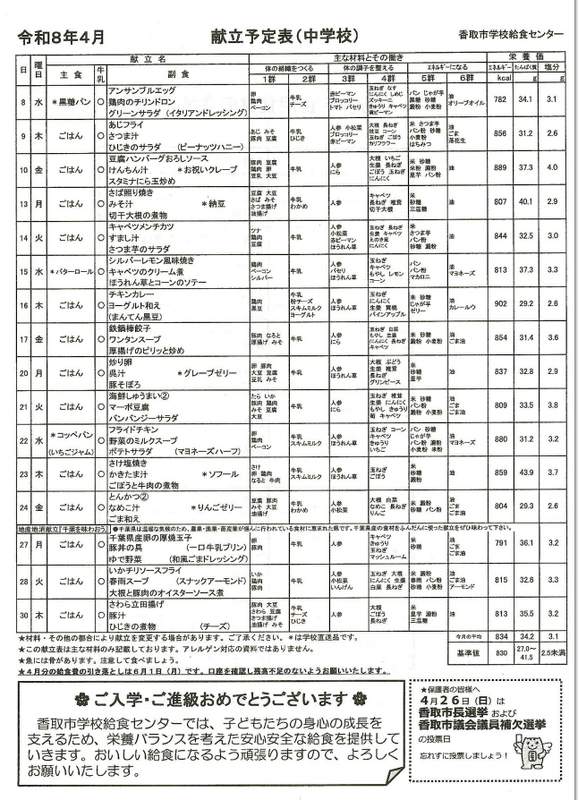 【香取市学校給食センターから】 子供たちの心身の成長を支えるため、栄養バランスを考えた安全・安心な給食を提供していきます。おいしい給食になるよう頑張りますので、よろしくお願いいたします。 |
