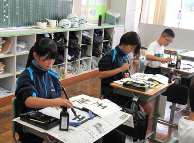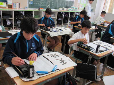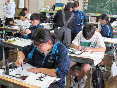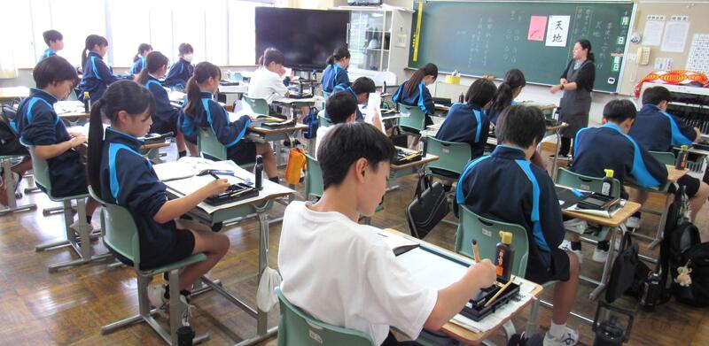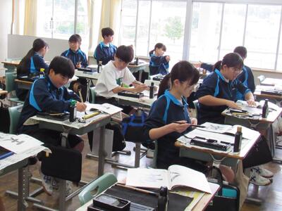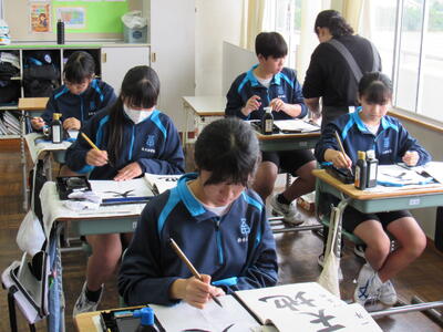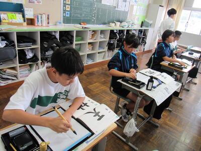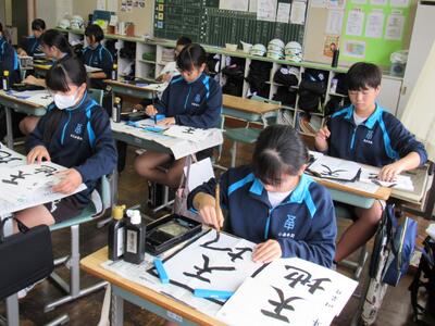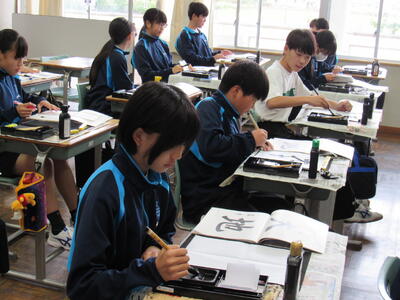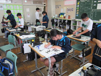国語で書写に取り組んでいます。生徒の皆さん、心を落ち着けて集中して取り組むことで、丁寧な字が書けるようになりますので、頑張ってください。
