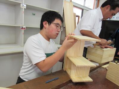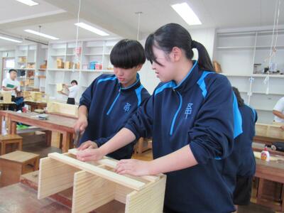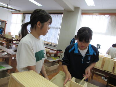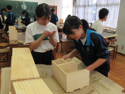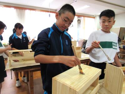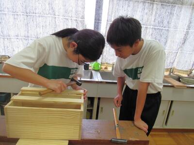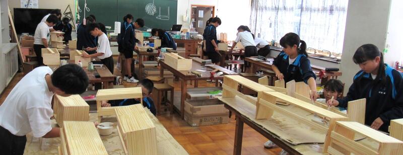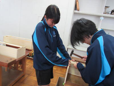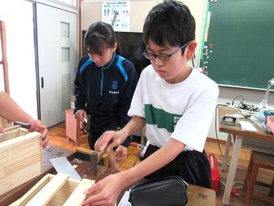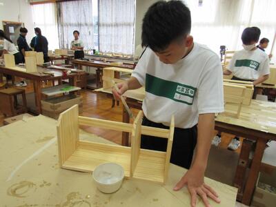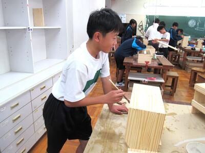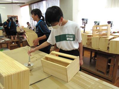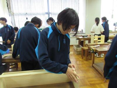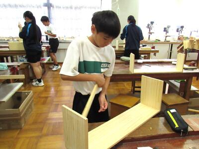技術で本棚作りに、一人一人集中して取り組んでいます。将来のDIY(Do It Yourself)につながることを期待しています。1年生の全作品が、18日(土)文化祭で体育館に展示されます。