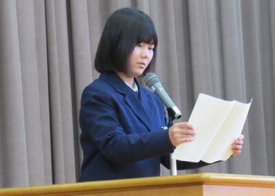 全校集会前に表彰伝達を行いました。社会を明るくする運動作文コンテストで表彰された金子さん(1年)の作品を紹介します。