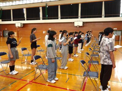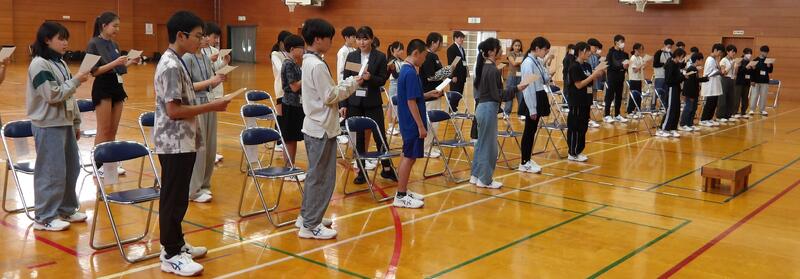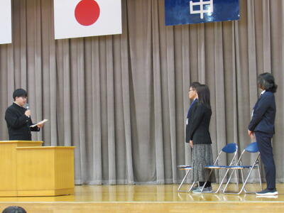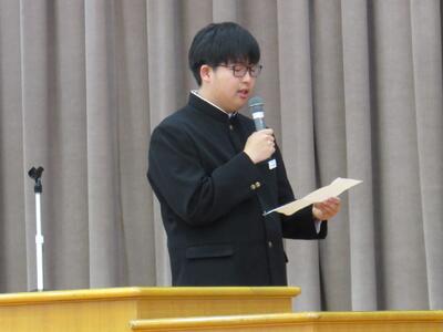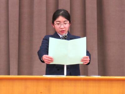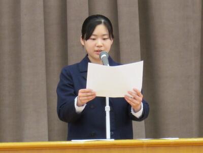 「3年生、皆さんとの出会いに感謝しています。五中ライフを一緒に3年間過ごせてよかったです。2年生、来年度は学校の顔として、佐原五中を支えていってください。1年生、短い時間でしたが、すごく前から一緒にいたような人たち、毎日心が癒やされました。五中の歌声、皆さんの優しさ、その一つ一つが私の細胞に刻み込まれています。私も、皆さんみたいに優しい人になると決めています。別れは人を成長させるという素敵な言葉がありますが、私も大きく成長したいと思います。お互いに頑張りましょう。」