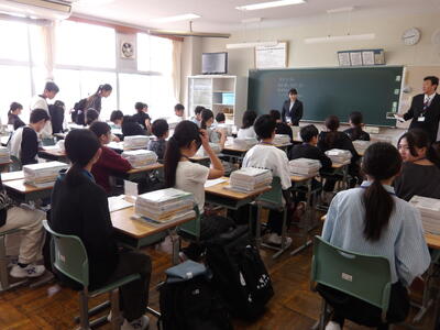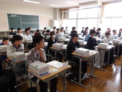 4月6日(月)午後から新入生の入学前指導を行いました。体育館で入学式の練習、1年1組の教室で教科書の配付や提出物の確認等を行いました。新入生の皆さん、入学式の呼名では、一人一人の大きな返事を期待しています。