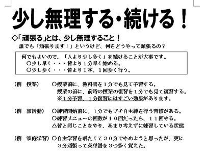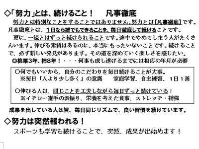 1年前の今日、私はイチロー選手の凡事徹底、大谷翔平選手の凡事徹底について話し、資料も配付しました。二人の凡事徹底は、どのような内容だったでしょうか。