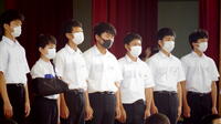 体育祭練習の初日、今年度のスローガンが発表されました。今年度は、3年生の仲條漣さんが考えた『「破竹之勢」~未来へつなげ五中の勢い~』に決まりました。4年ぶりの体育祭に向けて、体育主任から「五中の体育祭をみんなが新たに創っていく、ここから新たな伝統を創っていく」という話がありました。また、生徒会長からも「みんなで体育祭を盛り上げていこう」と力強い話がありました。みんなで体育祭を盛り上げて、新たな伝統を築き、その勢いを今後(未来)へとつなげていきましょう。体育祭を盛り上げる応援団の団長・副団長のみなさんです。よろしくお願いします。