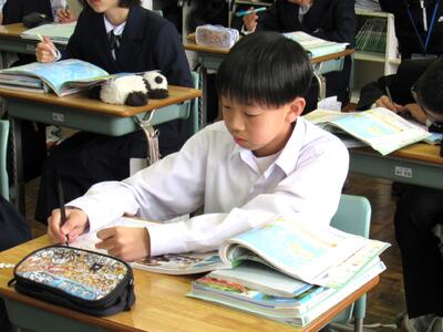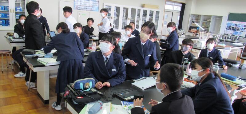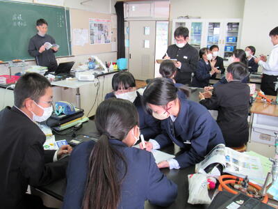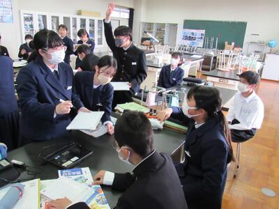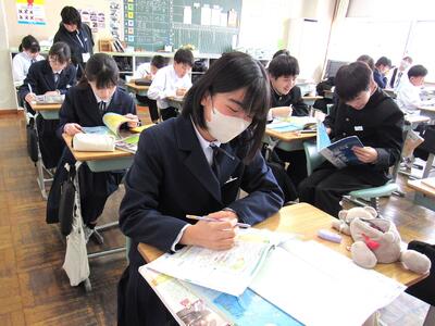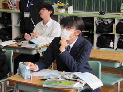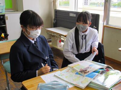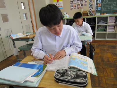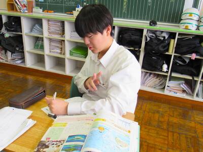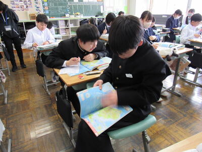 授業の様子(1年 社・理) 投稿日時 : 03/18 五中管理者 カテゴリ:今日の出来事 1年生の授業(1組:社会、2組:理科)の様子です。生徒の皆さん、どの教科も年度末の大事な学習ですので、頑張っていきましょう。 【1年1組 社会】 世界地理で、オセアニア州の学習に取り組んでいます。地図帳で、国名や地形を確認しています。 【1年2組 理科】 クイズ形式で単元のまとめ学習に取り組んでいます。班対抗なので、皆さんやる気満々です。