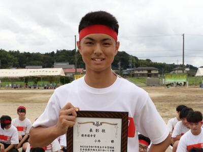 開会に先立ちまして、全日本型競技空手道選手権大会で日本一になった小林さん(3年)に対して、優秀選手賞の表彰を行いました。