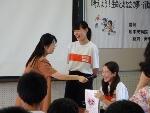 6月26日(月),本年度第1回目となる生徒集会が開催されました。昨年度から,生徒の自治活動をさらに促進していくことをねらって生徒会本部が企画・運営しながら様々な内容を取り入れていますが,今回は①なかよしエクササイズ(じゃんけん名前集めゲーム)で場を和ませ,②ピックアップ委員会コーナーでは,生活委員会が挨拶の標語募集の結果と表彰を行い,学習委員会は今月の家庭学習チャレンジのクラス賞の表彰と「ノートのとり方の工夫」について実際のノートを拡大投影機を使いながらわかりやすく説明してくれました。