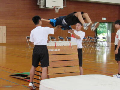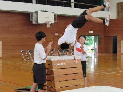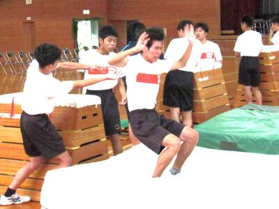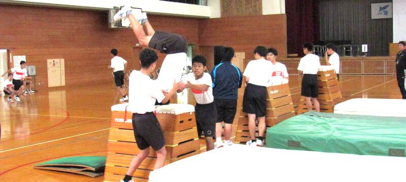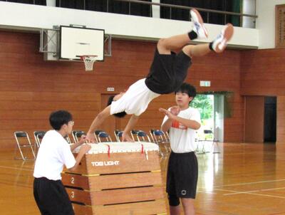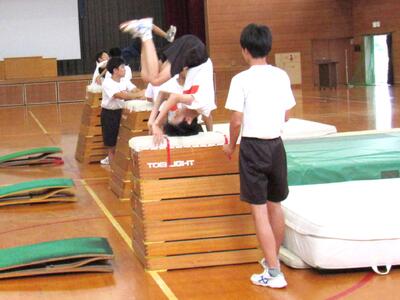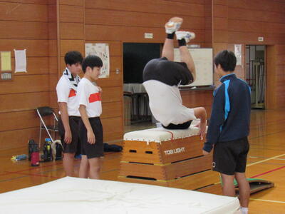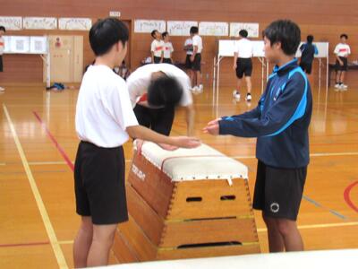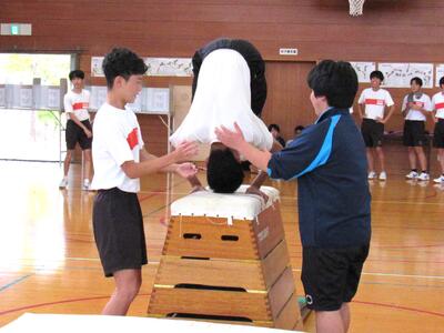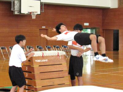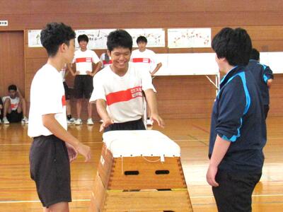 男子は、器械運動の跳び箱に取り組んでいます。皆さん、勇気を出して挑戦しています。