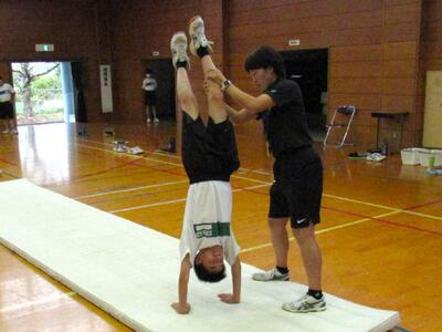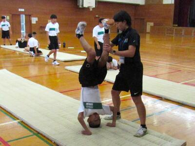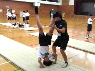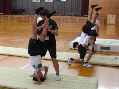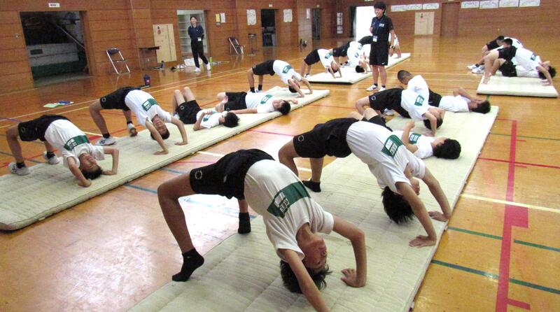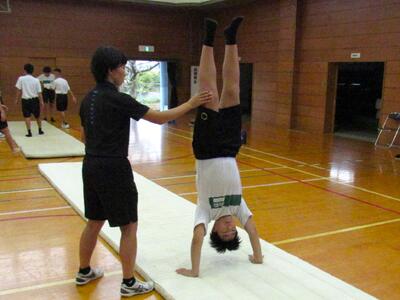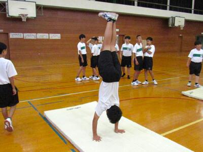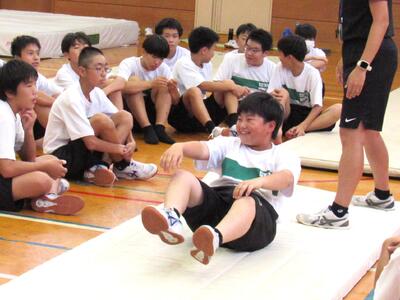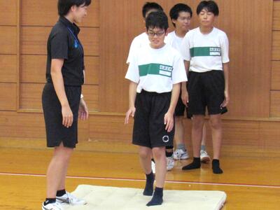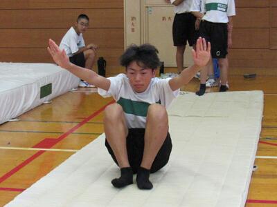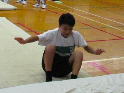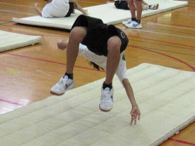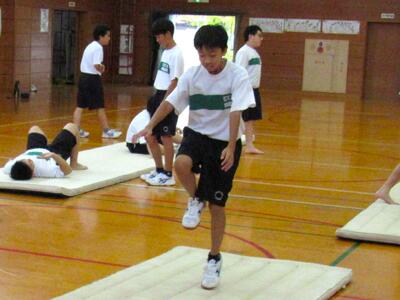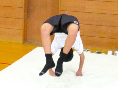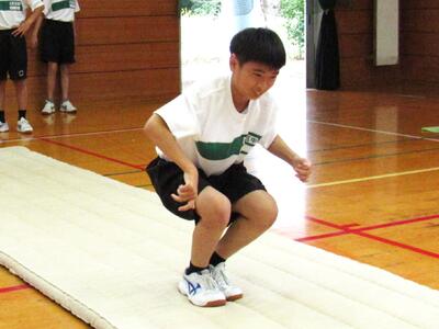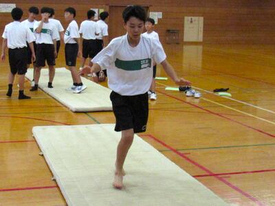男子は、器械運動(マット運動)に取り組んでいます。皆さん、頑張って挑戦しています。