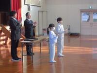 全校集会後には、図画工作、書写等で優秀な成績を納めた児童に賞状を伝達しました。また、先日行われたマラソン大会で、これまでの記録を更新した児童2名に、「新記録賞」の盾を贈りました。