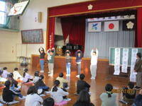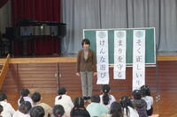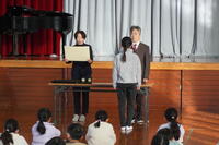 校歌斉唱、校長の話に引き続き、生徒指導担当教諭から冬休みの過ごし方について話をしました。ここでは5年生がクイズ形式で内容を確認しました。協力していくれた5年生は、わかりやすく全校児童に問いかけをしました。聞いているこどもたちも真剣に考えて、答えを示しました。