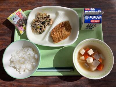 今日の給食は節分にちなんだ献立。たらのりごまフライにごはん、けんちん汁に青菜おかか炒め、牛乳に節分の豆が出されました。豆は「魔を滅する」という語呂合わせで邪気を払う力があると信じられていることから、豆まきをすると言われています。(諸説あります)。そして、福もやってきました。昨年度SSS(スクールサポートスタッフ)として勤務されていた方がお子さんを出産され、その元気な姿を親子ともども見せてくれました。まさに、『福』来たる!
