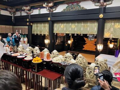 ちなみに、この大饗祭ですが、香取神宮で 毎年11月30日に行われる大切なお祭りです。昔、神さまが国を治めたあと、いっしょに働いた神々をもてなしたことが元になっています。新しいお米や地元の食べものを神さまにお供えして、一年の実りに感謝するお祭りです。夕方から、かがり火の明かりだけで行われるため、とても静かで厳かな雰囲気 が特徴です。