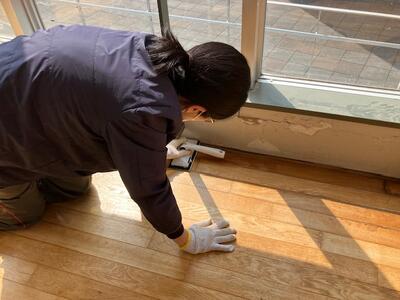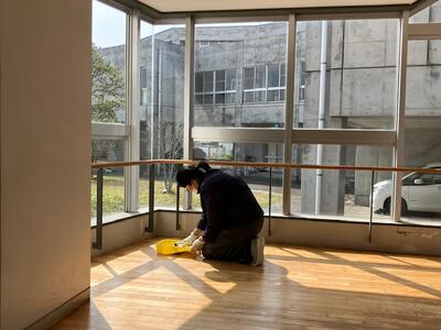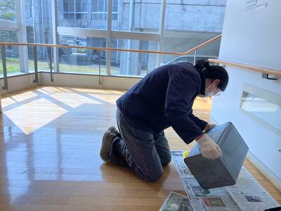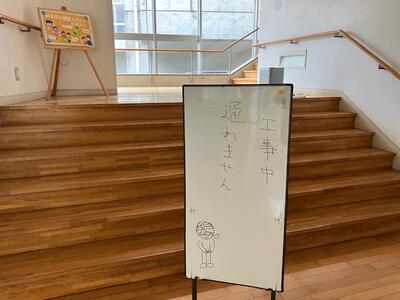 昼休みには図書室1階のタタミスペースで1年生が寄贈していただいた囲碁盤で五目並べに興じていました。また、3年昇降口からあが階段る踊り場では3年職員が床の修繕を行い、気持ちの良い教育環境づくりを進めていました。