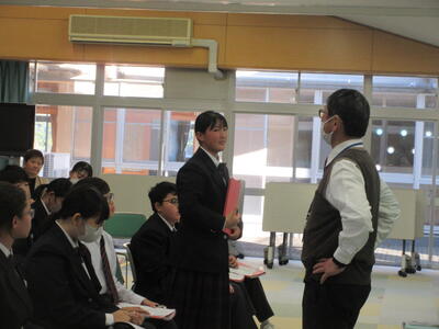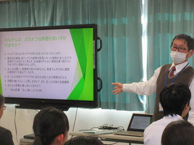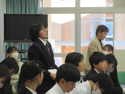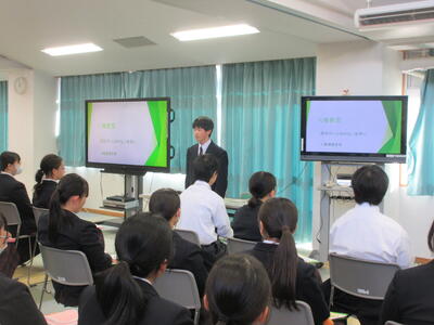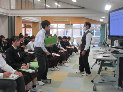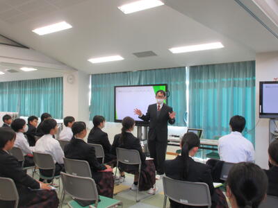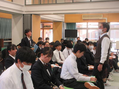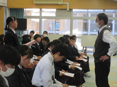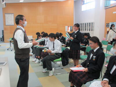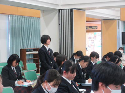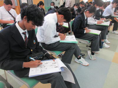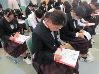 来週12月4日から10日までは人権週間です。人権啓発キャッチコピーは『「誰か」のことじゃない。』今回講師にお招きした方は北川修一さま。講師の北川先生の話術で生徒は一気に引き込まれ、人権とは何かじっくり考える時間となりました。配付されたイラストの吹き出し部分を考える中で、知らず知らずにステレオタイプ(固定観念)をもっていることに気づかされました。また、DVD視聴をとおして、情報リテラシーについての理解を深めました。